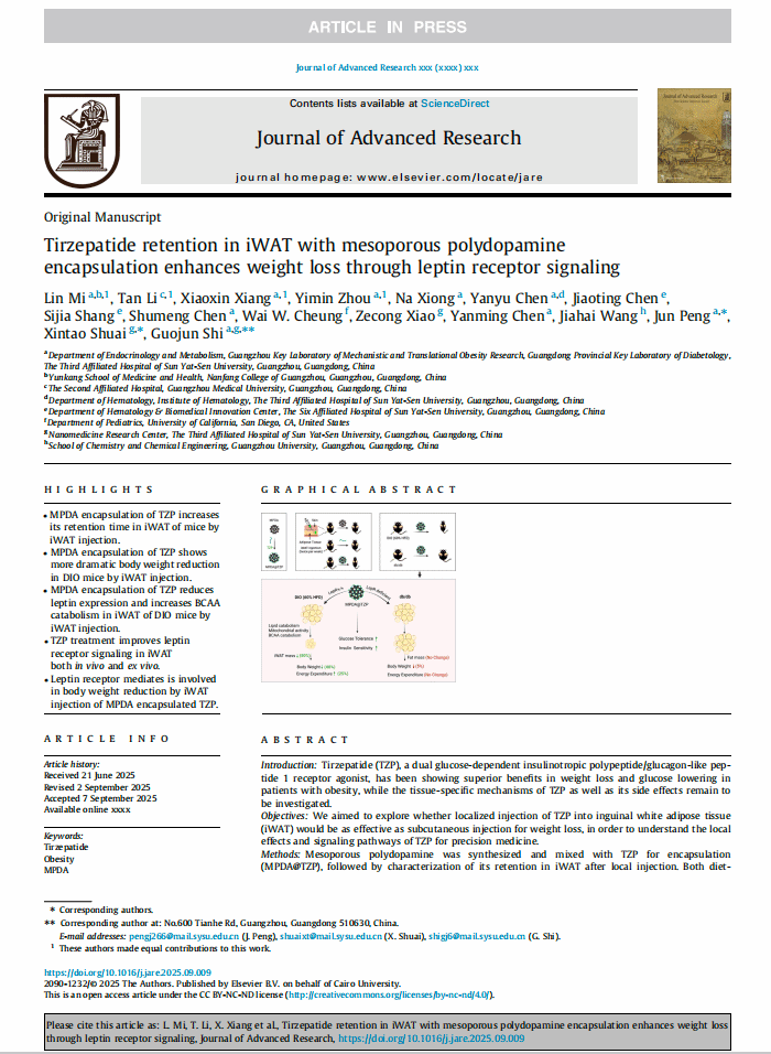 米琳老师在刊物《Journal of Advanced science》(JCR分区:Q1,IF=13)发表“Tirzepatide retention in iWAT with mesoporous polydopamine encapsulation enhances weight loss through leptin receptor signaling”论文。