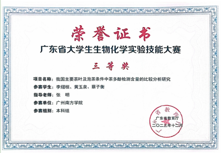 2023年12月,我院张明老师在2023年广东省大学生生物化学实验技能大赛带领团队荣获三等奖。