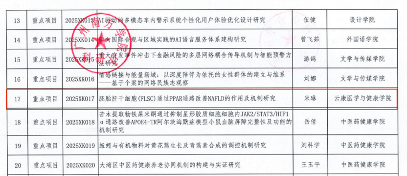 米琳老师的项目《胚胎肝干细胞(FLSC)通过PPAR通路改善NAFLD的作用及机制研究》申报立项了2025年度校级科研项目。
