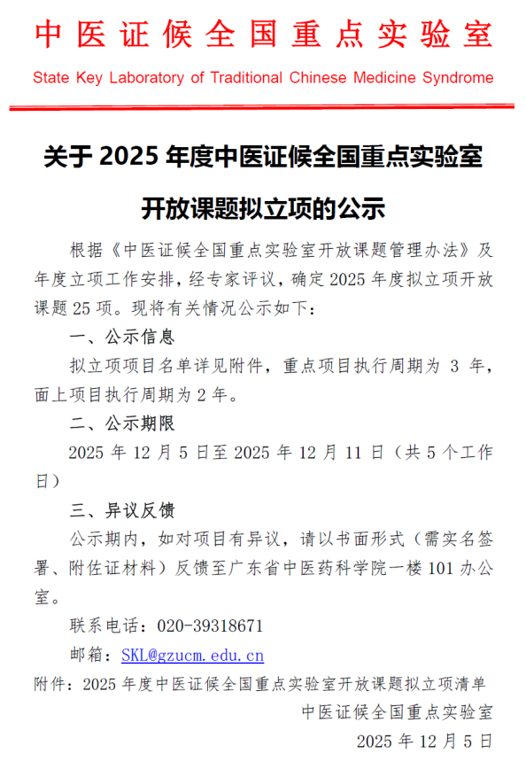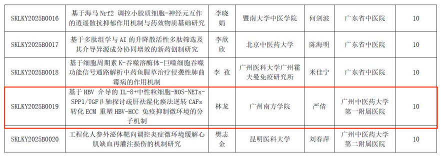 林龙副教授的项目《基于HBV介导的IL-8+中性粒细胞-ROS-NETs-SPP1/TGFβ轴探讨疏肝祛湿化瘀法逆转CAFs转化ECM重塑HBV-HCC免疫抑制微环境的分子机制》与广州中医药大学第一附属医院联合申报立项了2025年度中医证候全国重点实验室开放课题(面上项目)。