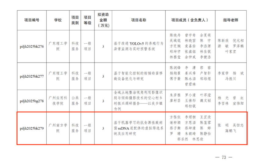 张明教授的项目《基于机器学习的抗食源性致病菌ssDNA适配体的虚拟筛选系统及应用研究》申报立项了2025年广东省科技创新战略专项资金(大学生科技创新培育)项目。