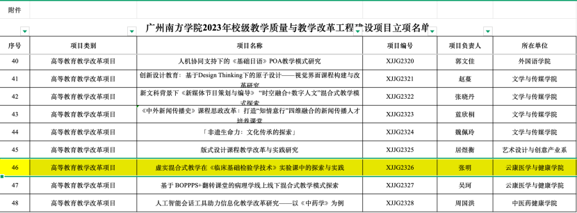 张明教授的项目<虚实混合式教学在《临床基础检验学技术》实验课中的探索与实践>申报立项了2023年度校级教学质量与教学改革工程-高等教育教学改革项目。