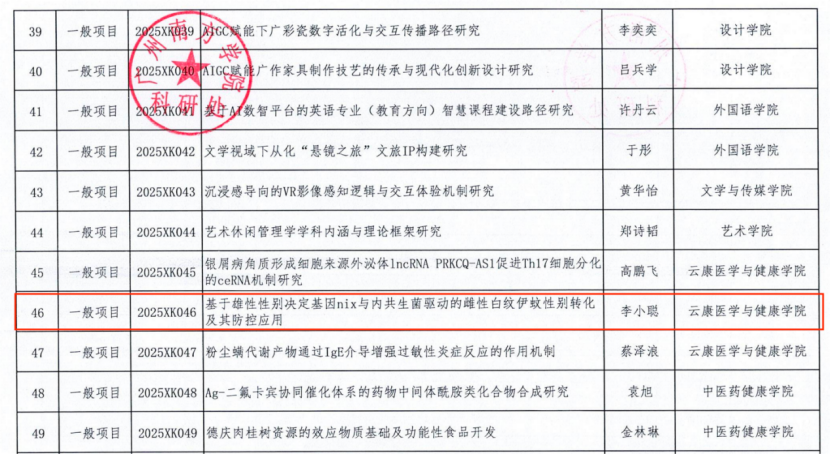 李小聪老师的项目《基于雄性性别决定基因nix与内共生菌驱动的雌性白纹伊蚊性别转化及其防控应用》申报立项了2025年度校级科研项目。