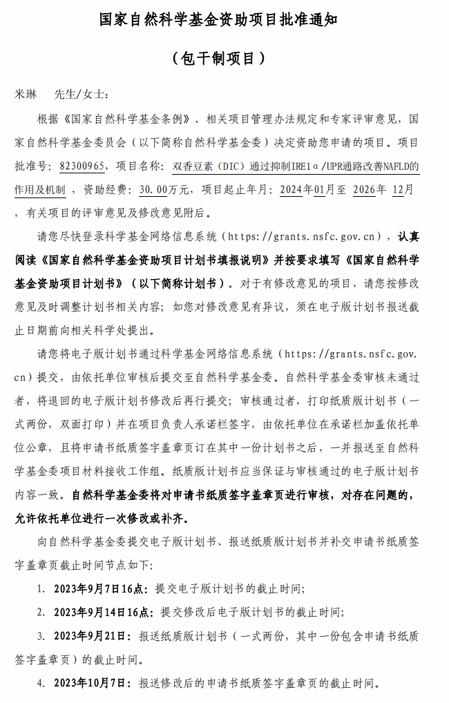 米琳老师的项目“双香豆素(DIC)通过抑制IRE1α/UPR通路改善NAFLD的作用及机制”申报立项国家自然科学基金项目。
