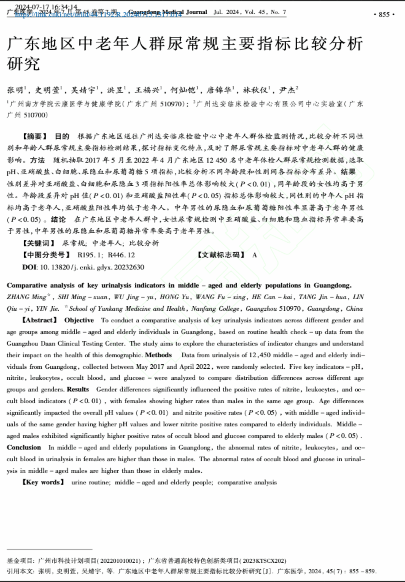 广东地区中老年人群尿常规主要指标比较分析研究