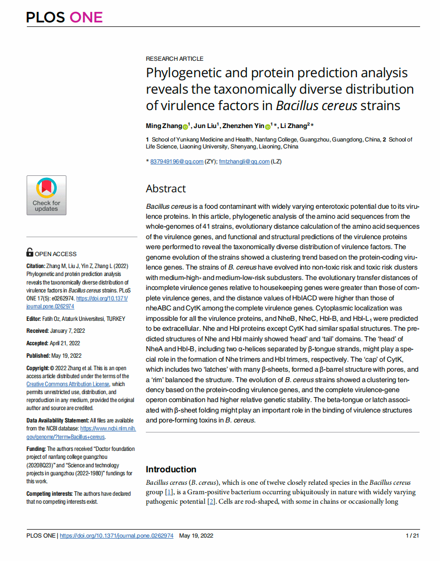 Phylogenetic and protein prediction analysis reveals the taxonomically diverse distribution of virulence factors in Bacillus cereus strains
