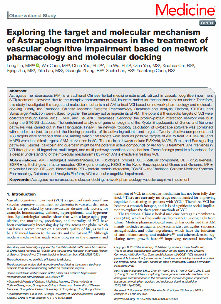 Exploring the target and molecular mechanism of Astragalus membranaceus in the treatment of vascular cognitive impairment based on network pharmacology and molecular docking